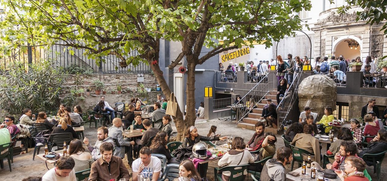El corazón de la terraza lo ocupa una gran higuera, bajo cuya sombra cuelgan farolillos de papel que, al caer la noche, iluminan el espacio con una calidez especial. El ambiente es íntimo, acogedor y un tanto decadente: tenderetes improvisados, sillas compartidas, vecinos charlando… todo invita a quedarse un rato más.