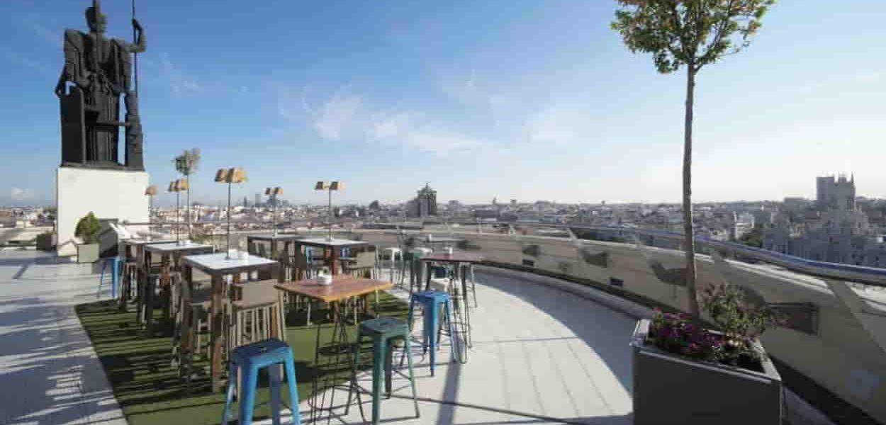 En este rooftop 360º junto a las vistas destaca la escultura de bronce de Minerva de Juan Luis Vassallo, que con su 7’60m de altura, representa a la diosa romana de la sabiduría, las artes y la estrategia militar y vela por todos los madrileños desde las alturas.