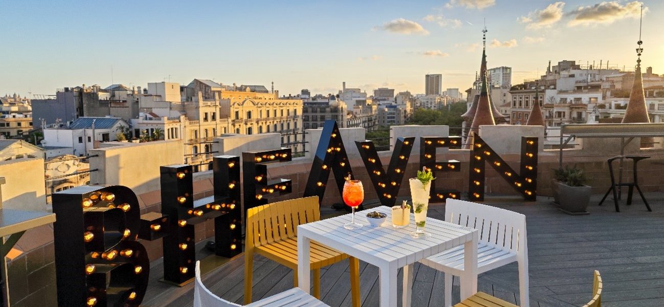 El rooftop B Heaven regala unas vistas panorámicas de Barcelona y a la vistas majestu majestuosidad de la Casa de les Punxes y deleitarte con la serenidad del mar Mediterráneo al fondo.