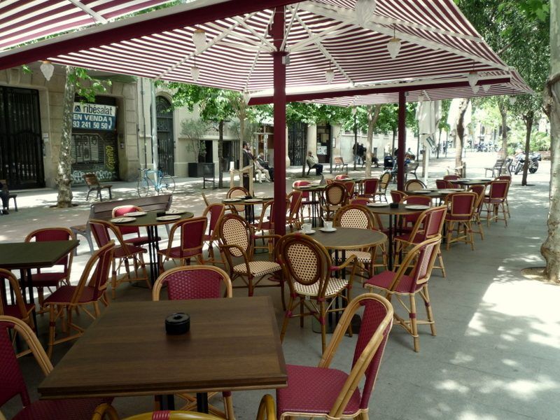 La terraza es una de las más grandes de la calle, y una opción afrancesada para quien sueña viajar a uba cafetería bistró sin salir de Barcelona en comidas, cenas o para tonar una copa.