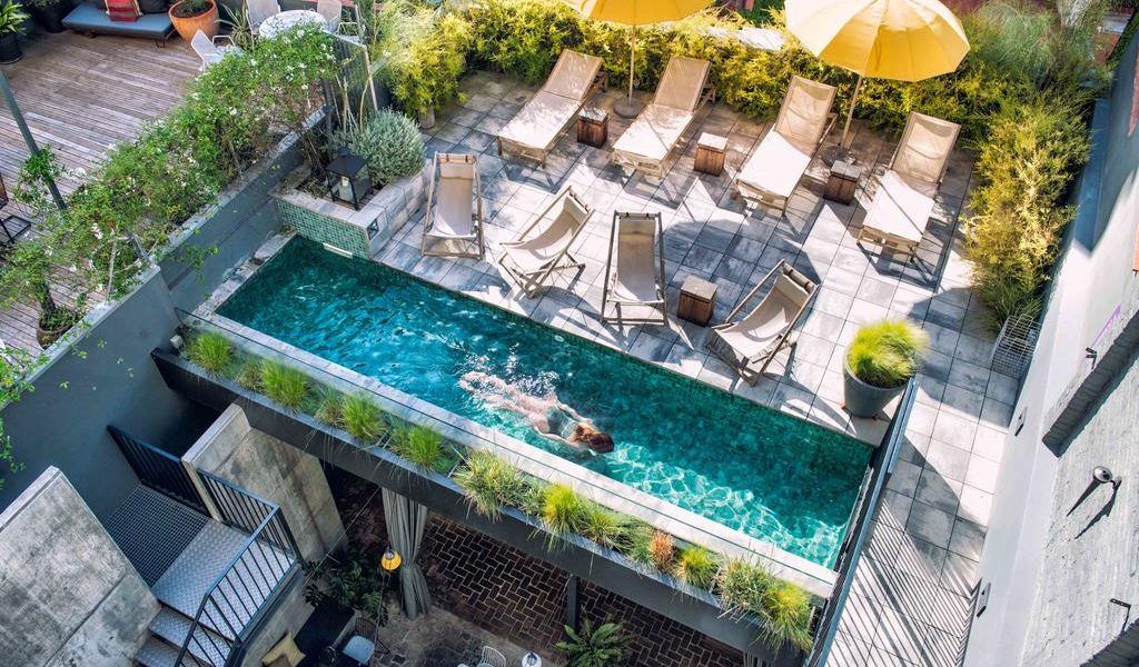 La terraza de este edificio de 1870 y abierto como hotel en 2017 es particular por estar dividida entre tres edificios,: en una zona se ubica un jardín de hierbas aromáticas y tomateras que sirven de huerto privad para el restaurante Brummell Kitchen, en la segunda azotea está un área de relax con una cama balinesa, y en la tercera la pequeña y romántica plunge pool.