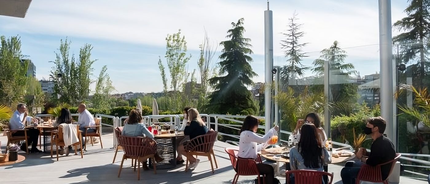 Ya sea para tomar algo ligero, compartir una comida deliciosa o celebrar un evento especial, esta terraza te invita a disfrutar de su preciosa vista a ras del skyline madrileño, con las emblemáticas cuatro torres en el horizonte, y con un color mágico al atardecer.