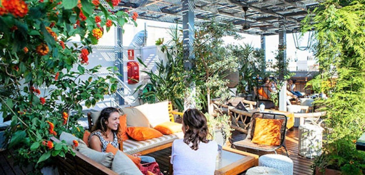 A tan solo 5 minutos de la Plaça Catalunya, en este rooftop destaca el ambiente que crea su cuidada decoración con muebles de madera, cojines de color natural y muchas plantas exóticas. Sientes más que estás en una terraza privada que en un hotel de 4 estrellas.